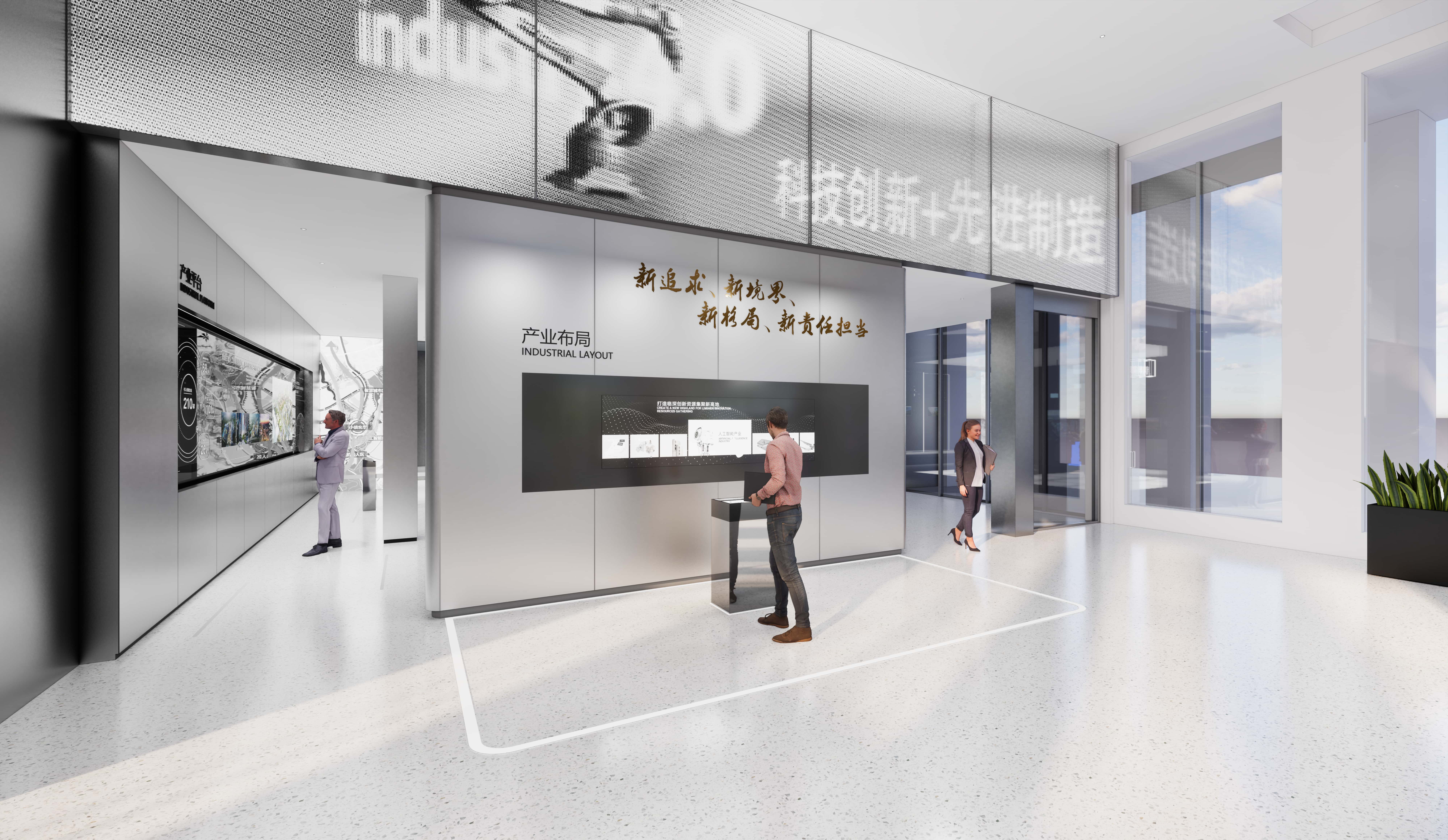 The central location of this area adopts the relevant enterprise product elements of artificial intelligence special small towns,and the spatial function planning of the small towns is pre recorded with ID cards. When the iPad central control operates to view a certain information ID card,the robotic arm will place the ID card in the slot next to it,and the middle screen will start playing the corresponding video information.