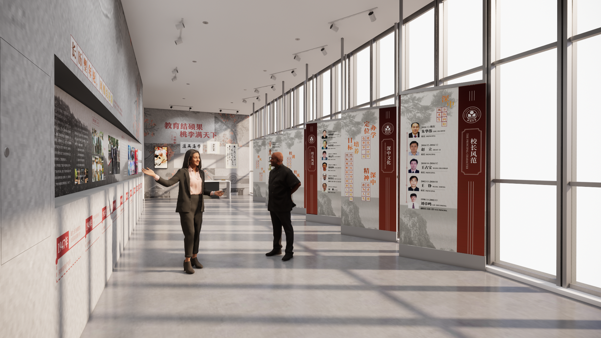 Entering the exhibition hall,what catches the eye is the image wall,combined with a circular ice screen that combines virtual and real elements,using phoenix wood as the intention to interpret the initial impression of Shenzhen Middle School.