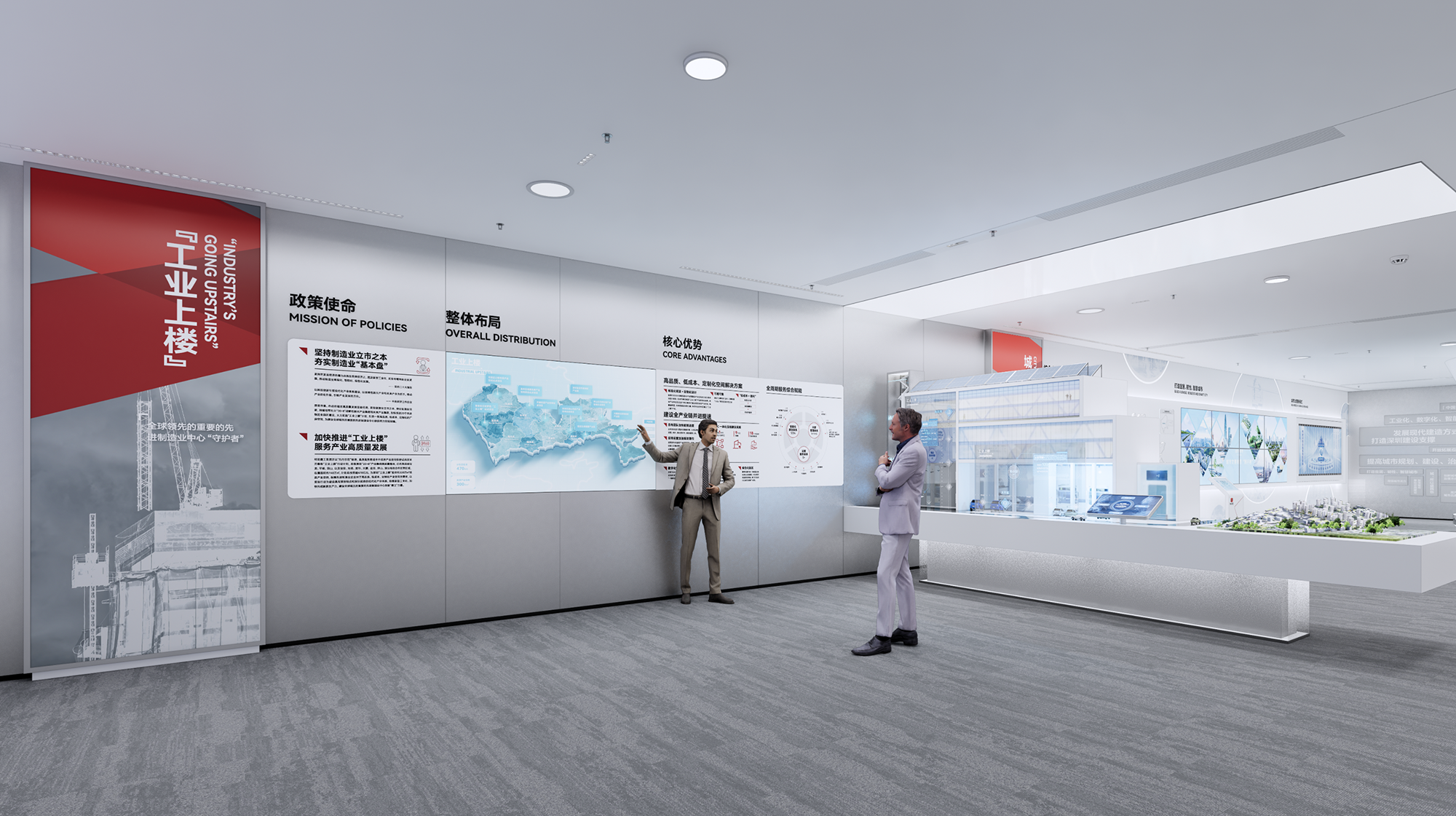 The industrial upstairs area is designed with a three-dimensional model based on the industrial upstairs standard factory building. Through transparent screen stacking and interactive interpretation,it showcases the industrial concept of going up and down is upstream and downstream.